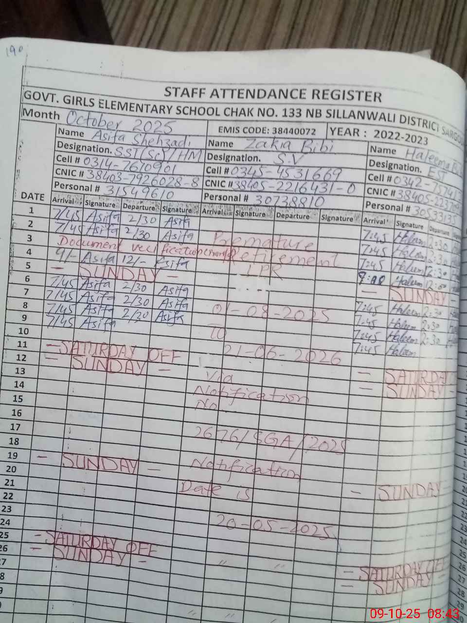 | CNIC | Full Name | Designation | R/C | Absence during last cal. month |