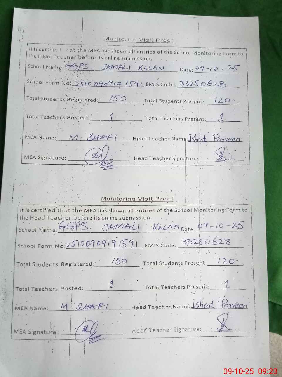 | Monitoring Date: 09-10-2025 | Start Time: 09-10-2025 08:43 AM | End Time: 09-10-2025 09:26 AM | Name of MEA: J-**** MU**** SH**** | |