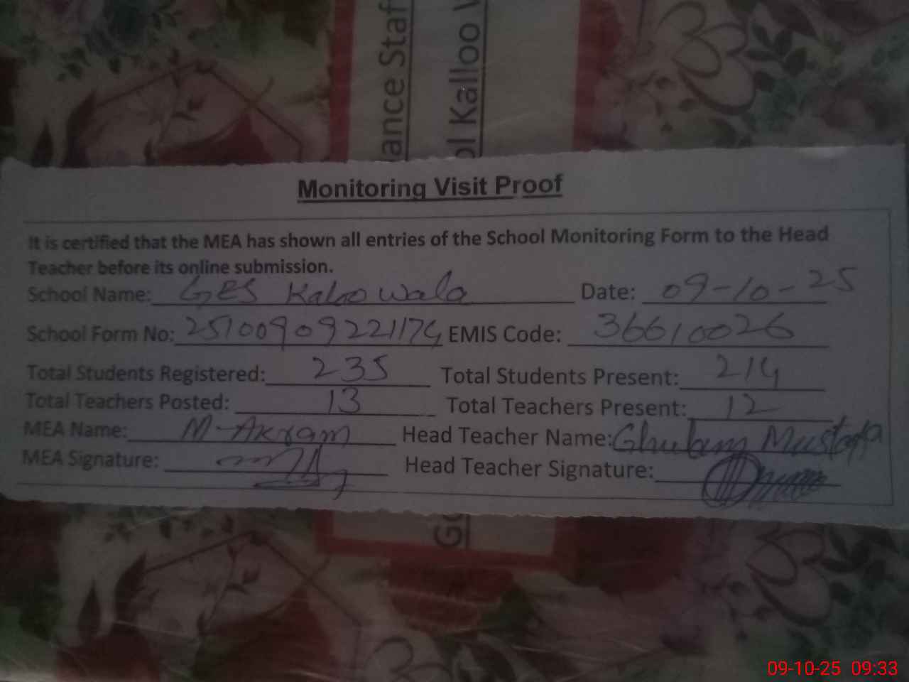 | Attendance Register | Head Teacher | MEA with School | Visit Proof |