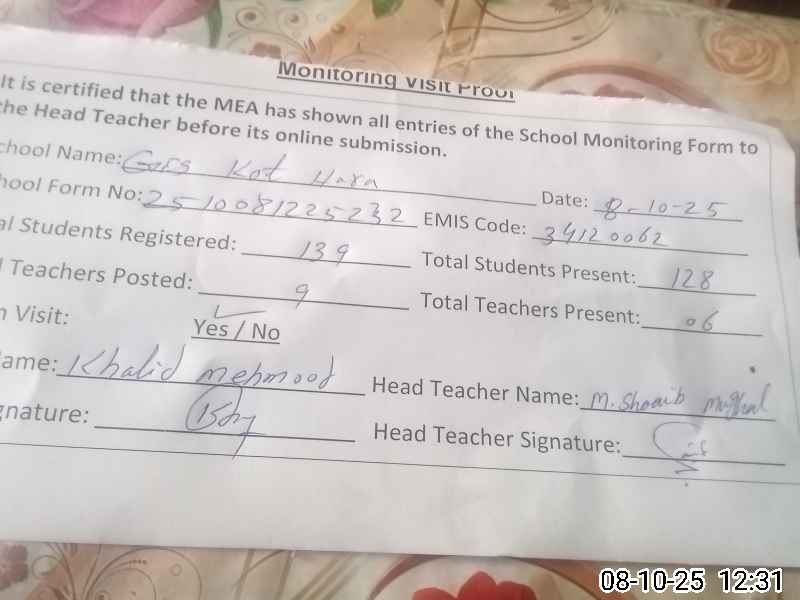| Attendance Register | Head Teacher | MEA with School | Visit Proof |