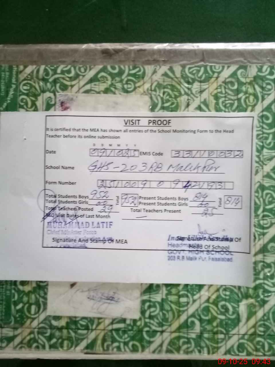 | Certified that this School was Inspected by the Undersigned MEA/DMO Today and the Information Stated Above is as Per Record. | |||||