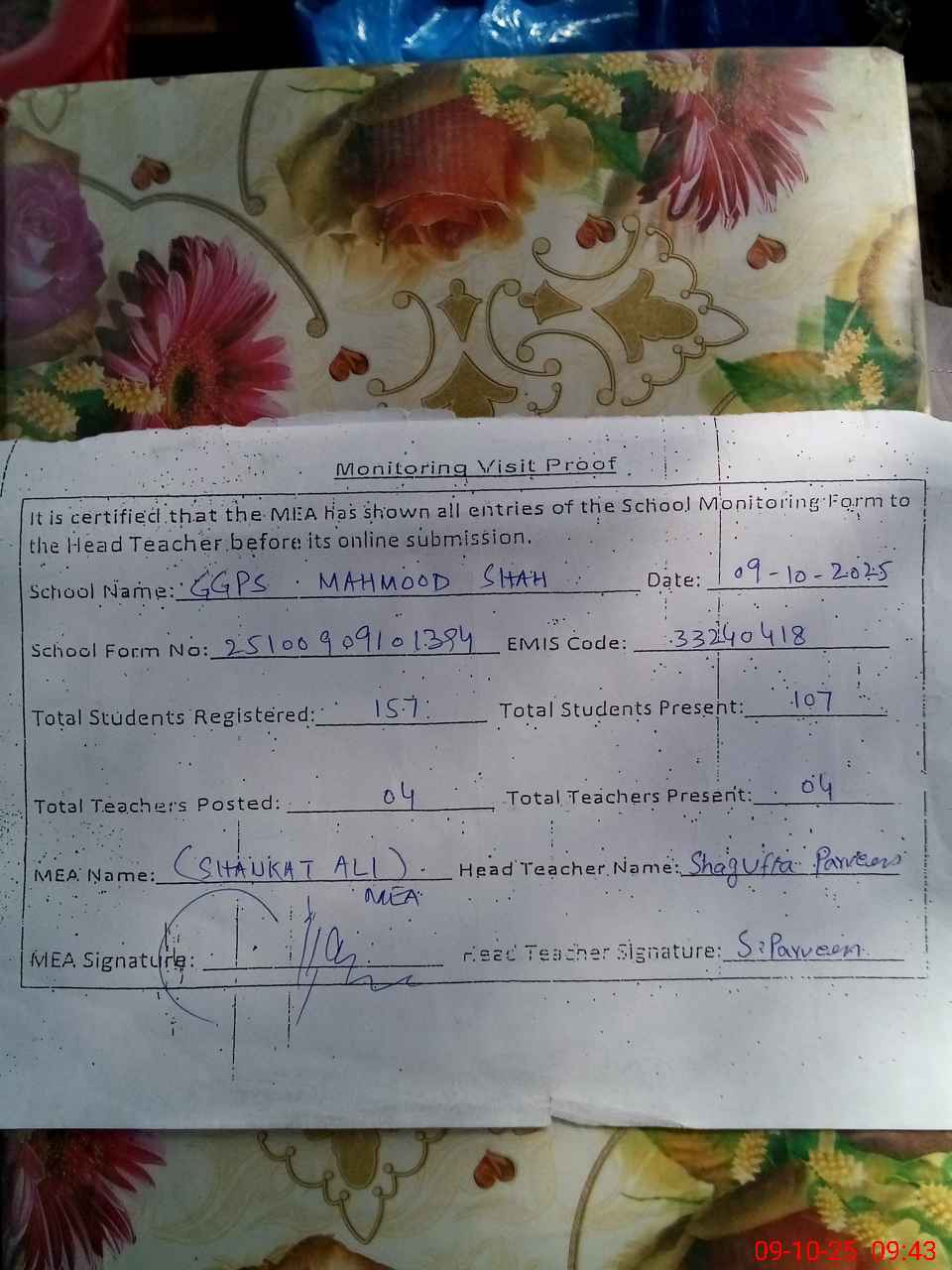 | EMIS Code: 33240418 | Name of School: GGPS MEHMOOD SHAH | |||
