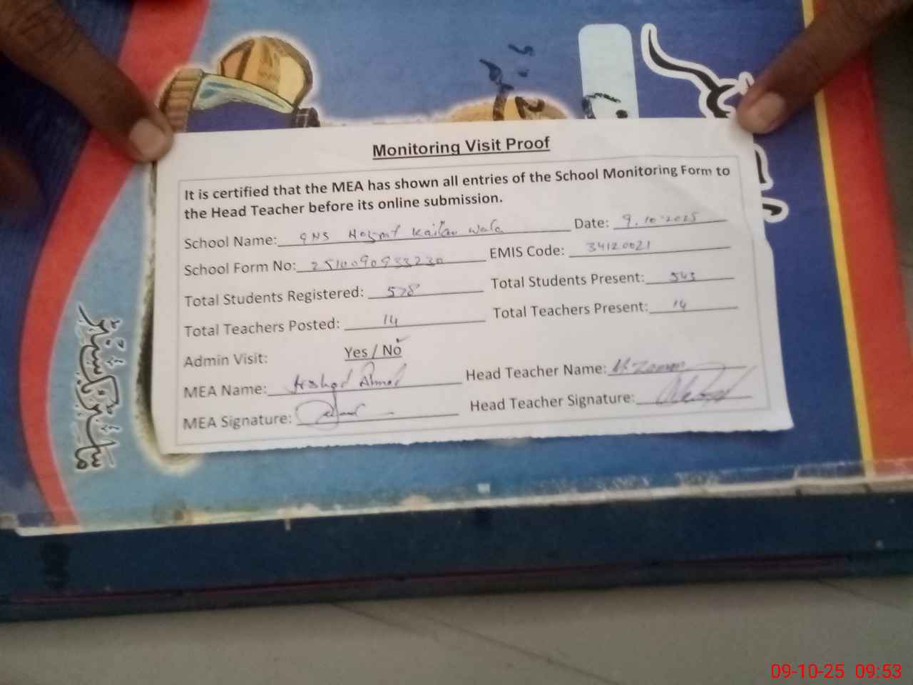 | Attendance Register | Head Teacher | MEA with School | Visit Proof |