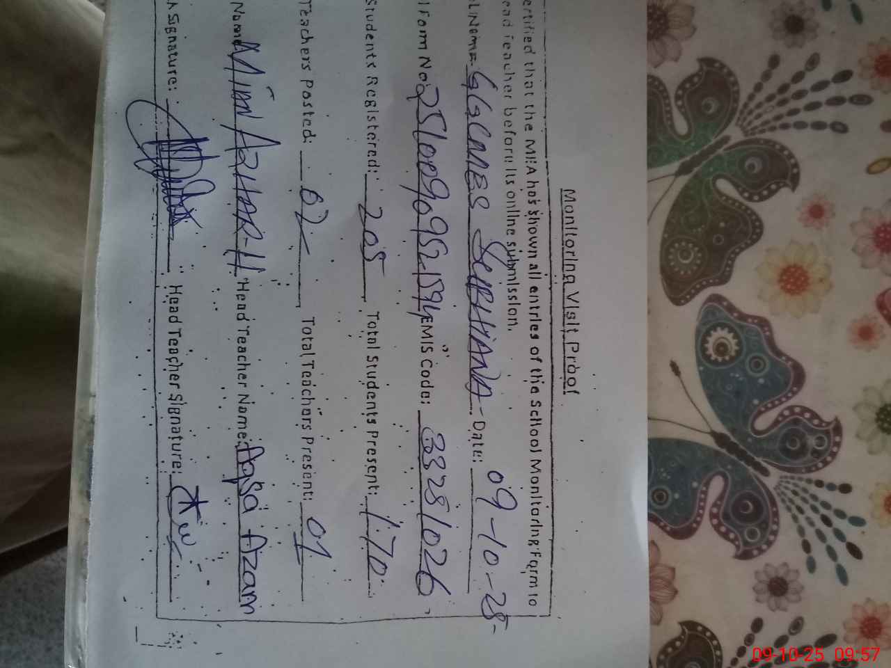 | Certified that this School was Inspected by the Undersigned MEA/DMO Today and the Information Stated Above is as Per Record. | |||||