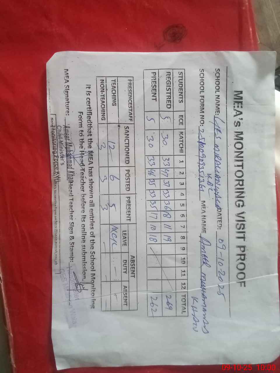| Attendance Register | Head Teacher | MEA with School | Visit Proof |