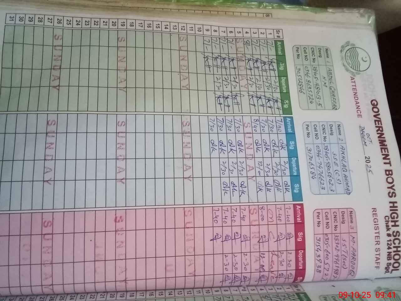 | CNIC | Full Name | Designation | R/C | Absence during last cal. month |