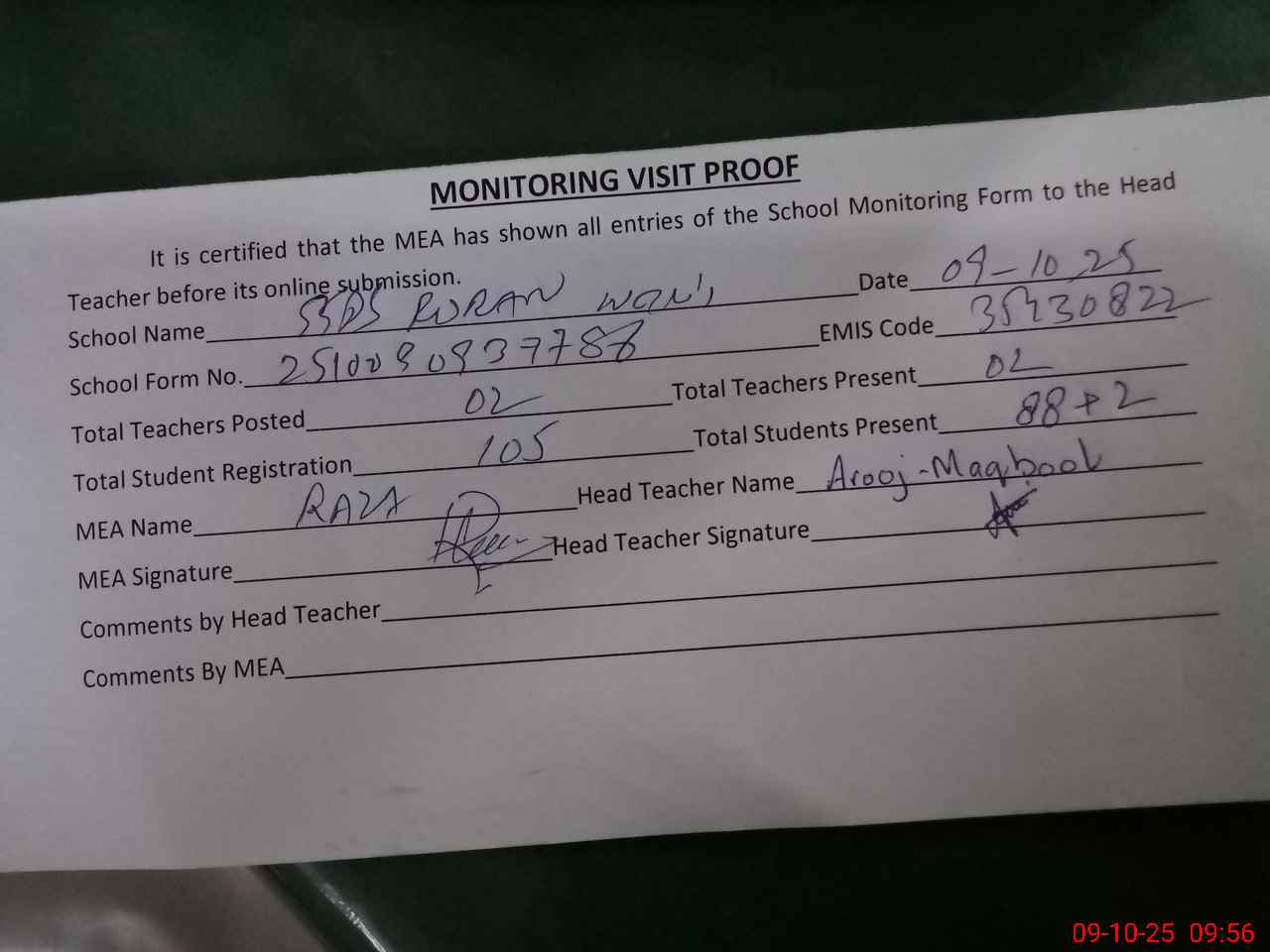 | Attendance Register | Head Teacher | MEA with School | Visit Proof |