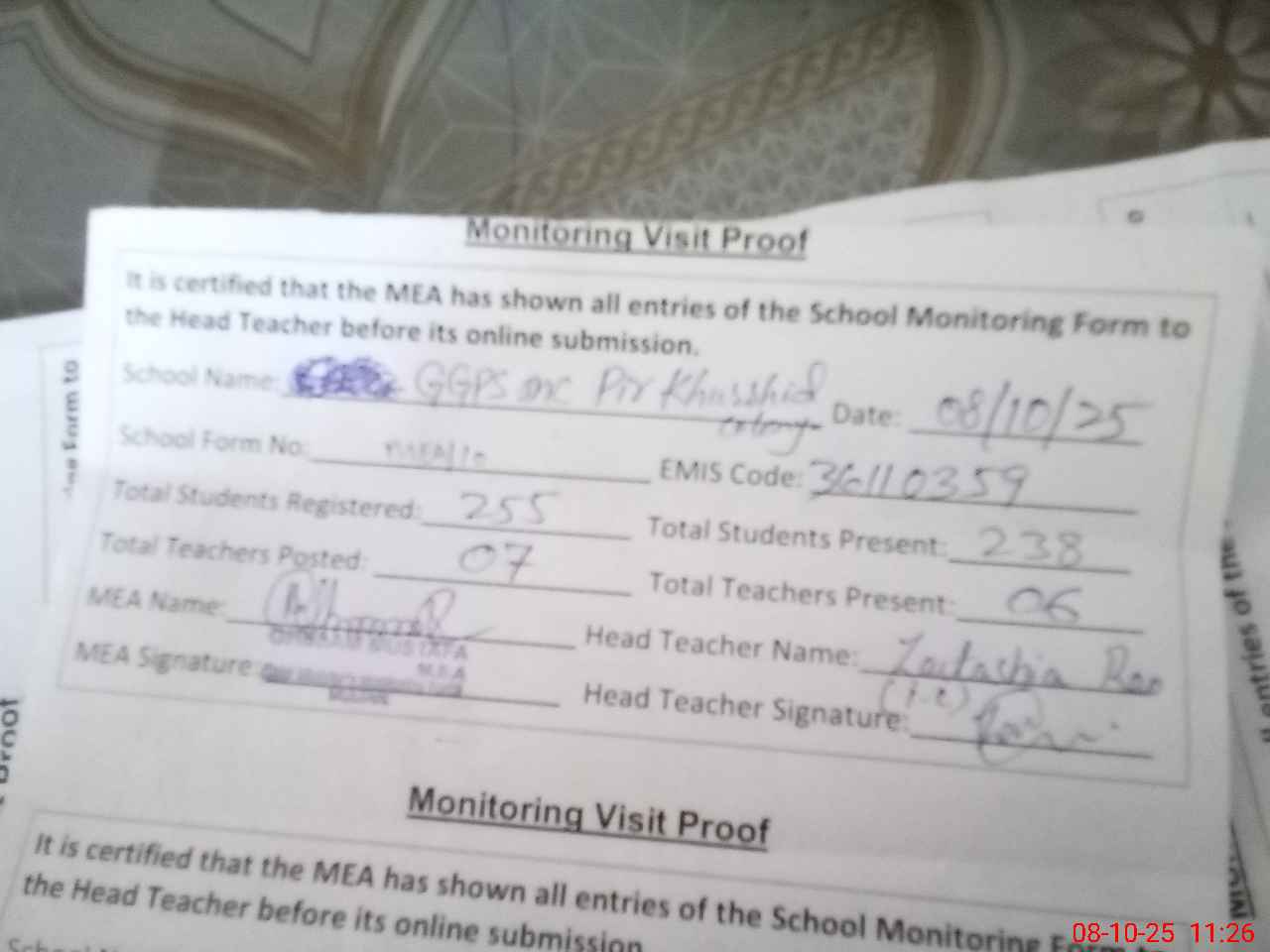 | Monitoring Date: 08-10-2025 | Start Time: 08-10-2025 10:54 AM | End Time: 08-10-2025 11:26 AM | Name of MEA: GH**** MU**** | |