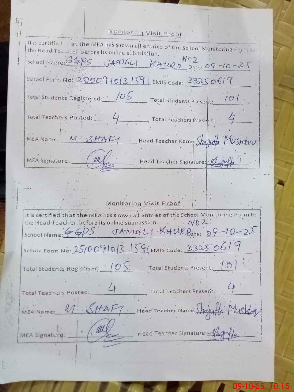 | Monitoring Date: 09-10-2025 | Start Time: 09-10-2025 09:42 AM | End Time: 09-10-2025 10:19 AM | Name of MEA: J-**** MU**** SH**** | |