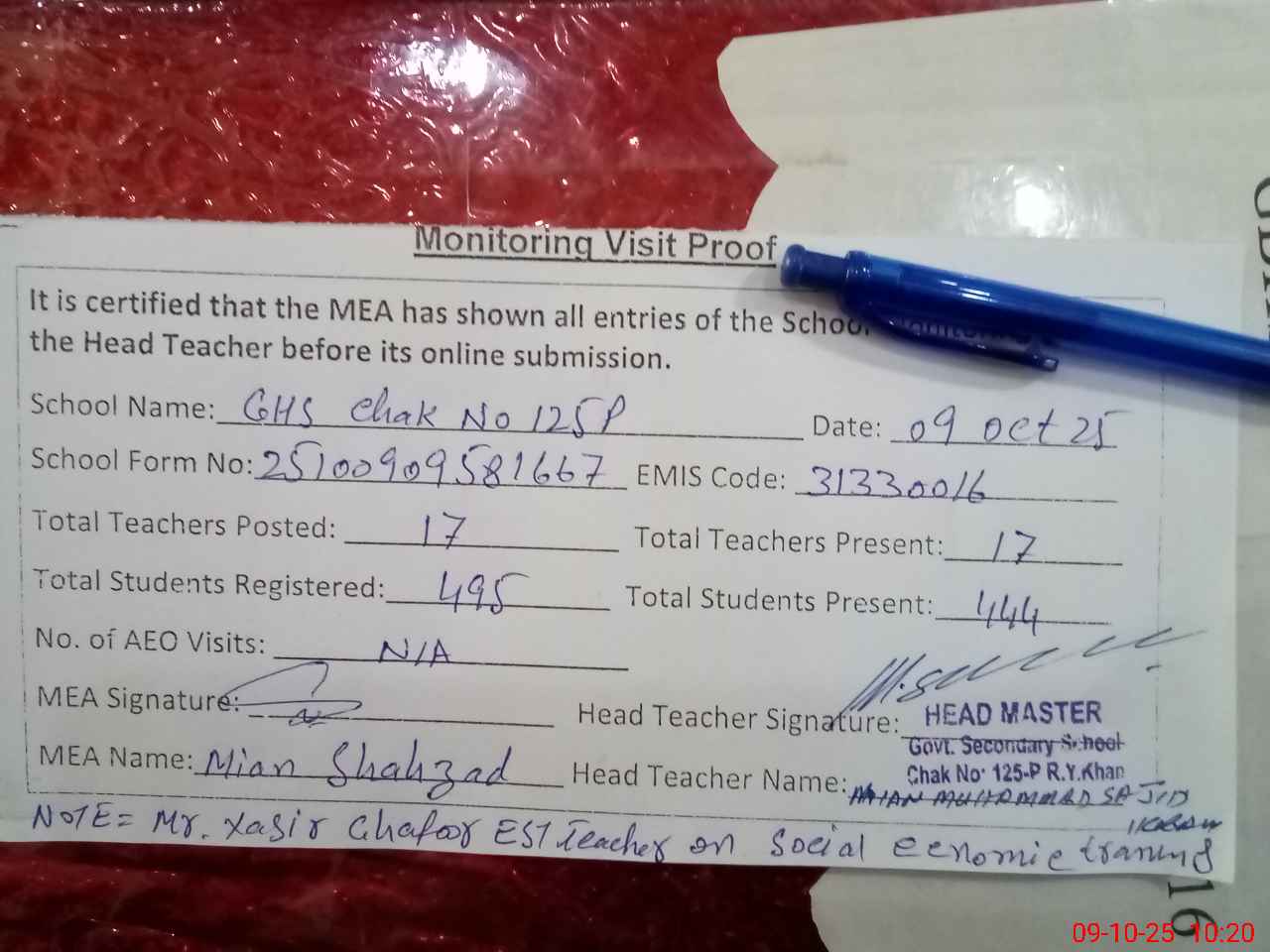 | EMIS Code: 31330016 | Name of School: GHS CHAK NO 125 P | |||
