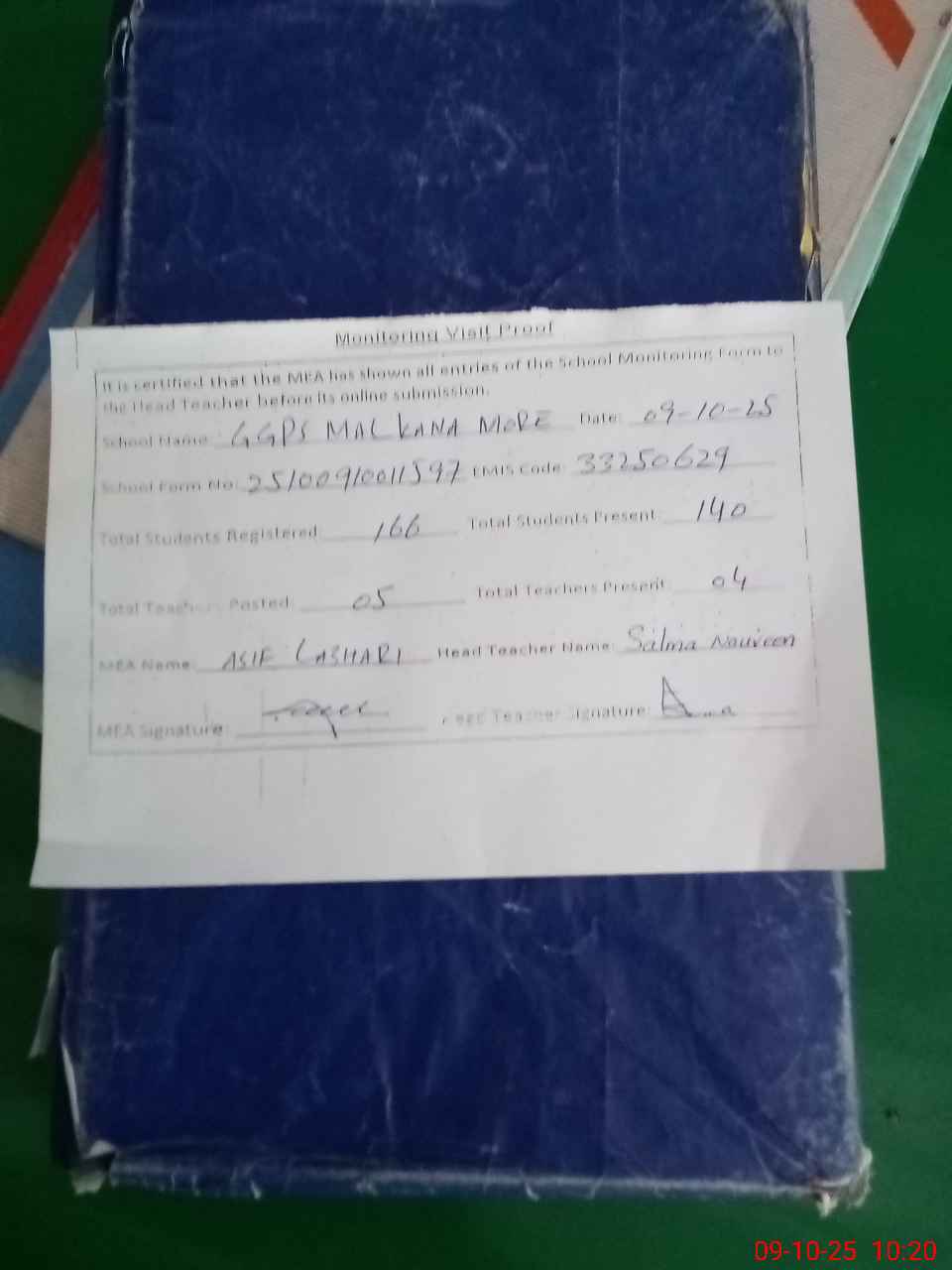 | Attendance Register | Head Teacher | MEA with School | Visit Proof |