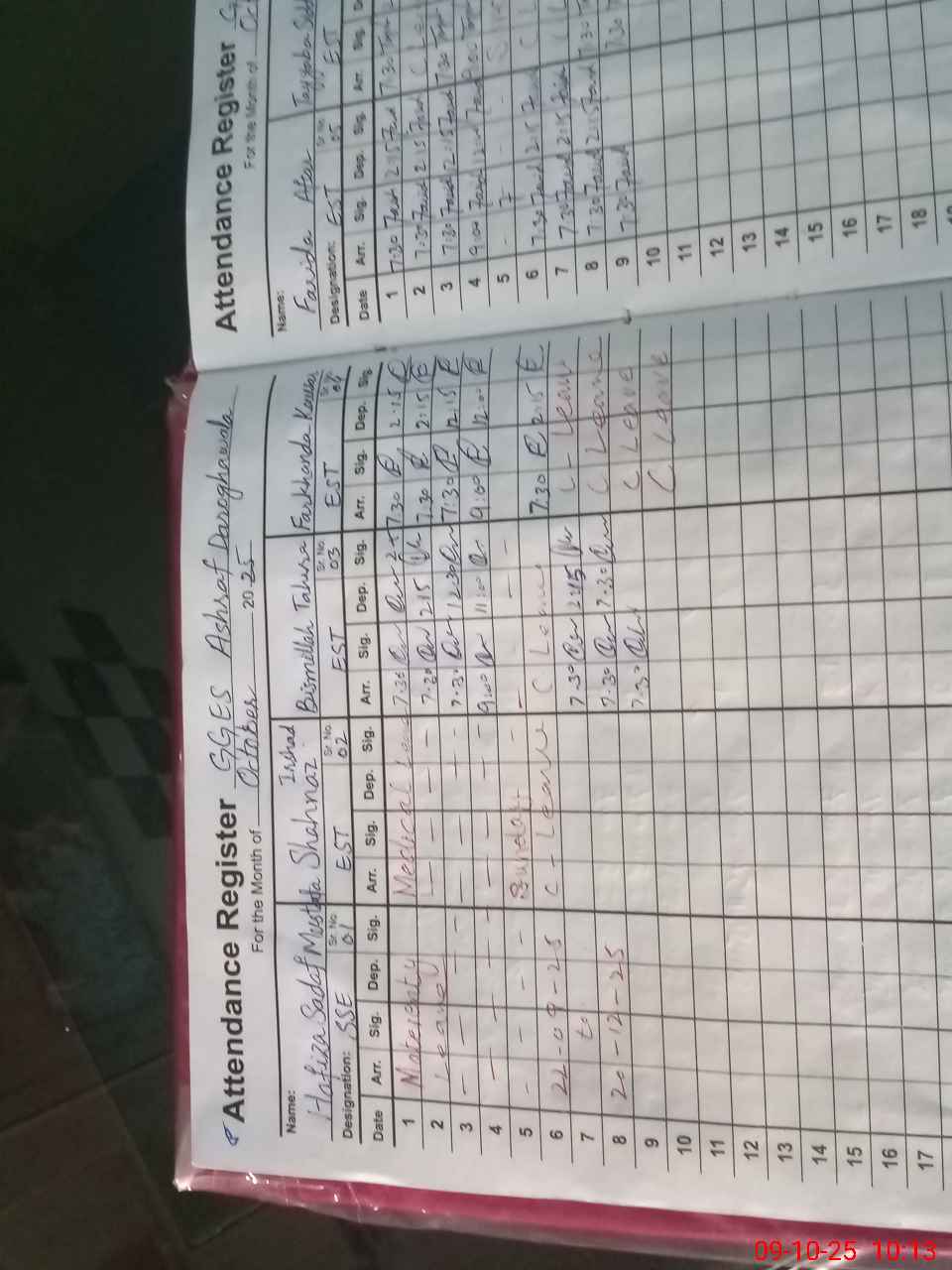 | Remarks (Use Separate Page if Required): 1 Hafiza Sadaf Mustafa SSE head misters on matrienty leave from 22nd september 2025 to 20 th December 2025 but still leave not sanctioned so mark her absent 2 Shehnaz Muhammad Irshad Est teacher on medical leave from 17th September 2025 to 23rd September2025 and 29th September 2025 to 4th October 2025 both leave still not sanctioned and also not present in school from 7th October 2025 to date of visit so mark her absent 3 Maryam Naz pst teacher on Materionty leave from 1st September 2025 to 29th November 2025 but still her leave not sanctioned so mark her absent 4 No visit of AEO in the month of September 2025 5 One toilet is used as a store | |||||
