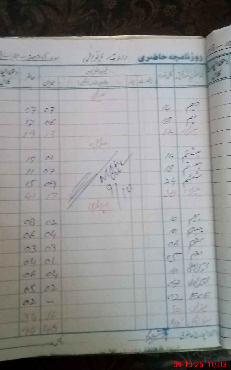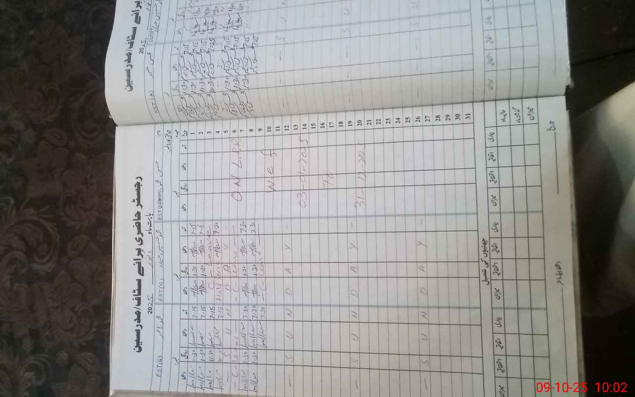 | Remarks (Use Separate Page if Required): Est Noor ul ain on temp duty without any written order by education administration I marked her Absent | |||||