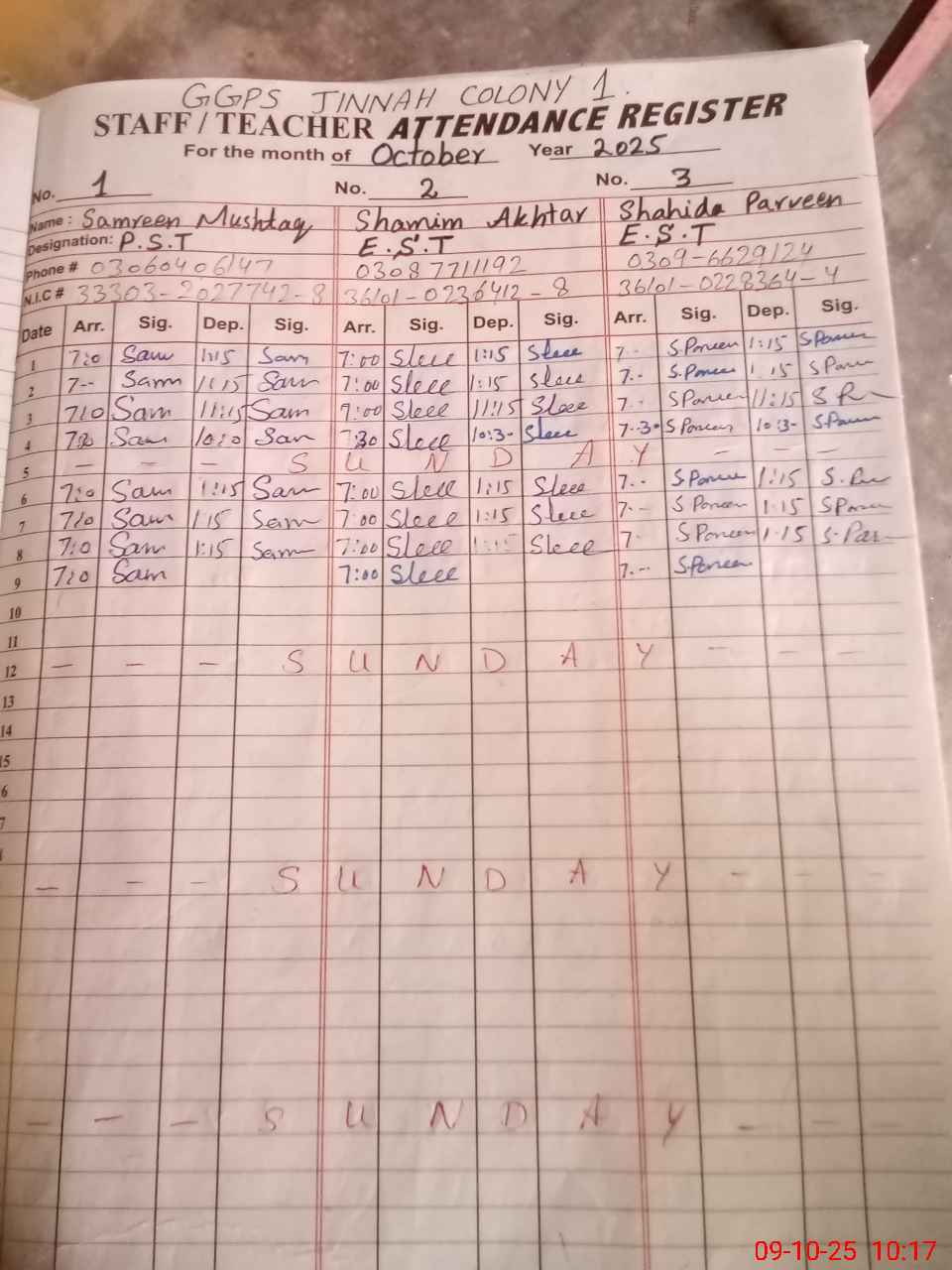 | CNIC | Full Name | Designation | R/C | Absence during last cal. month |