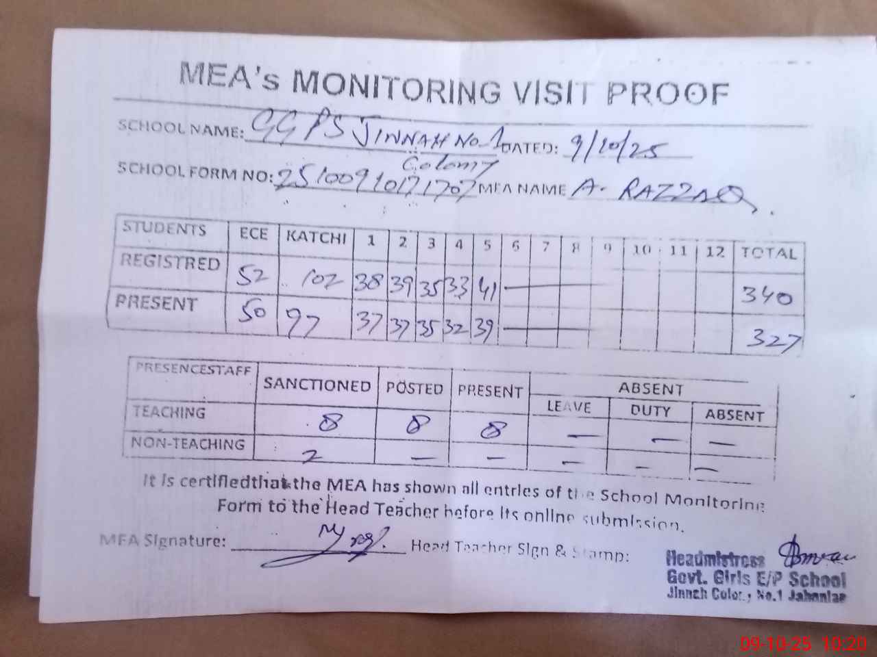 | Attendance Register | Head Teacher | MEA with School | Visit Proof |
