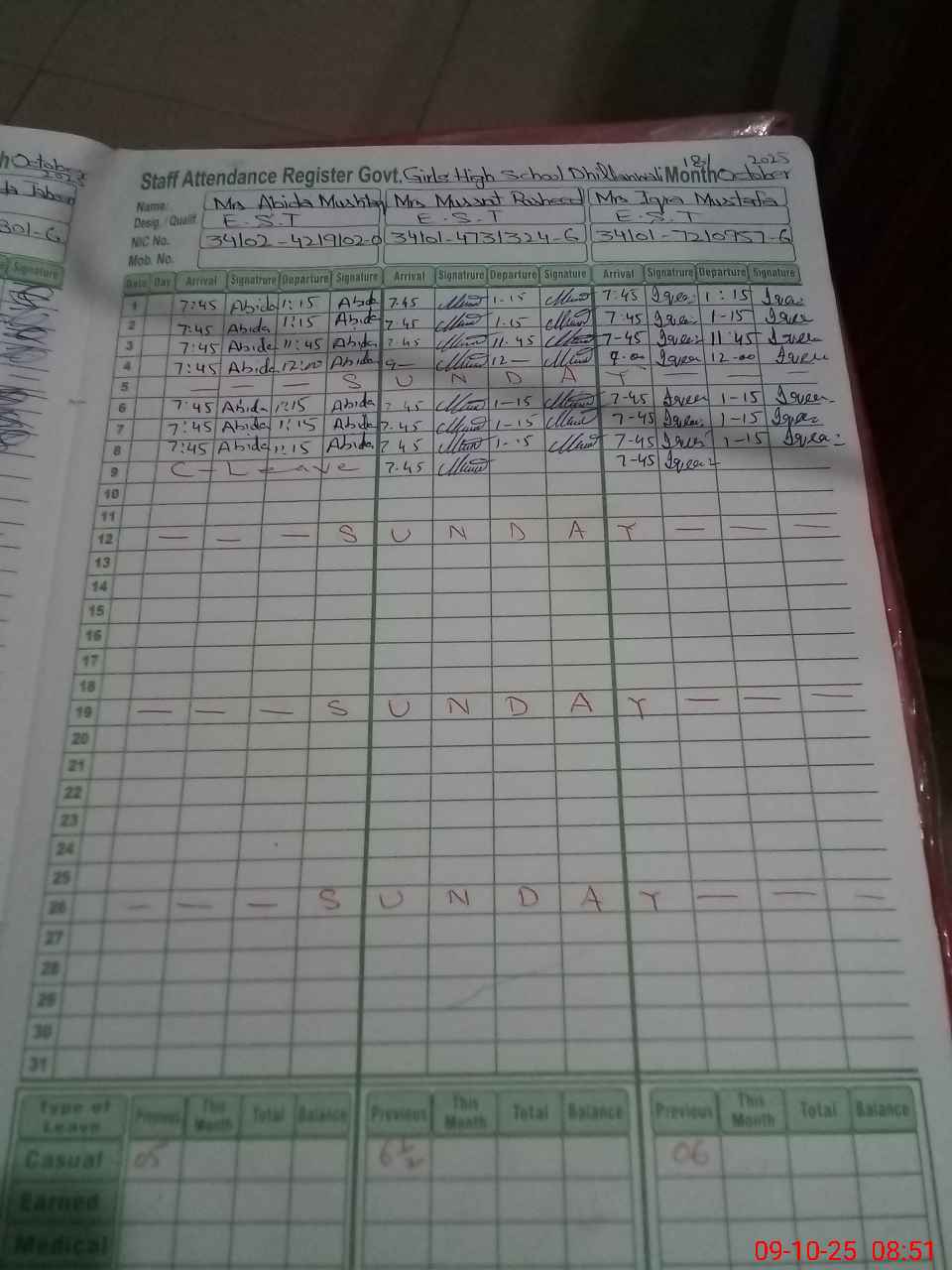 | CNIC | Full Name | Designation | R/C | Absence during last cal. month |