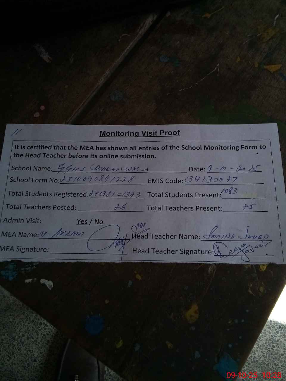 | Attendance Register | Head Teacher | MEA with School | Visit Proof |