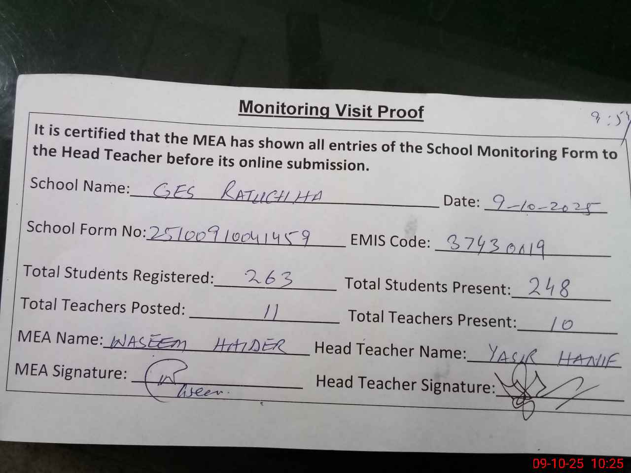 | Monitoring Date: 09-10-2025 | Start Time: 09-10-2025 09:54 AM | End Time: 09-10-2025 10:41 AM | Name of MEA: Wa**** Ha**** | |