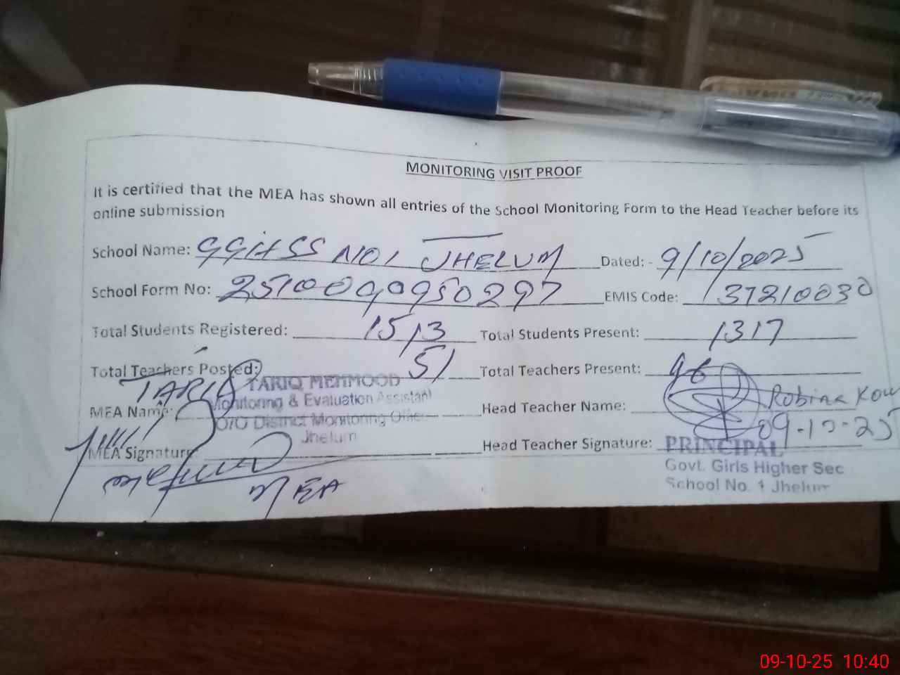 | Certified that this School was Inspected by the Undersigned MEA/DMO Today and the Information Stated Above is as Per Record. | |||||