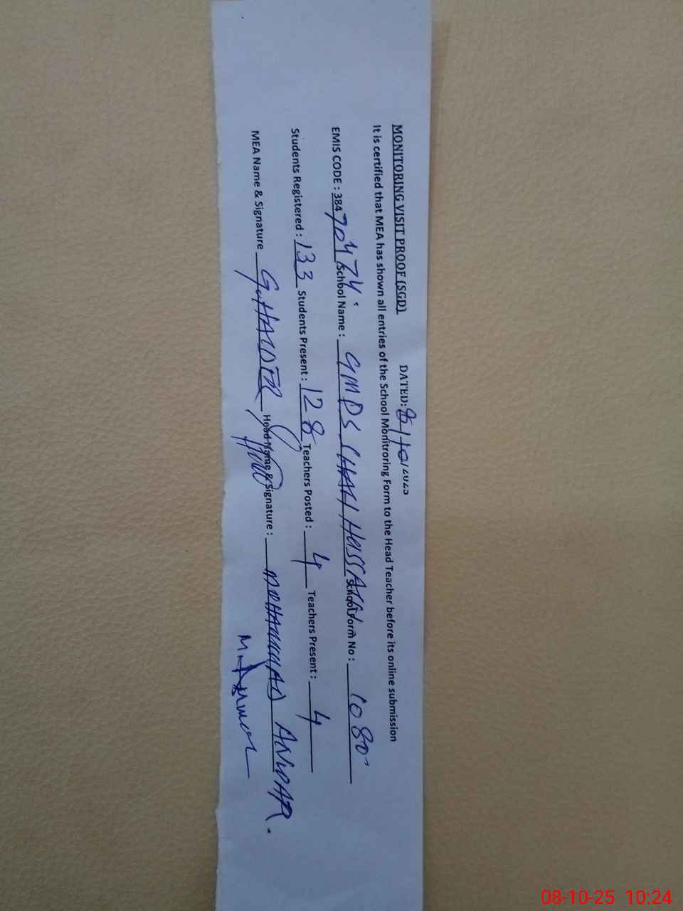 | Monitoring Date: 08-10-2025 | Start Time: 08-10-2025 09:50 AM | End Time: 08-10-2025 10:25 AM | Name of MEA: GH**** HA**** | |