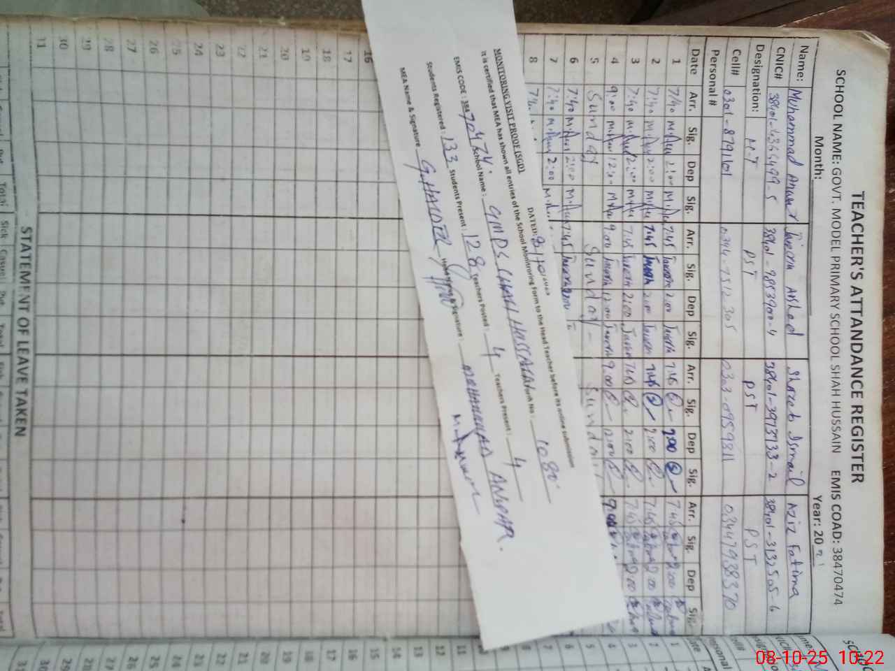| Name: MU**** AN**** Designation: (School Headmaster's/Headmistress's) PST Phone/Cell Number: 03**** |