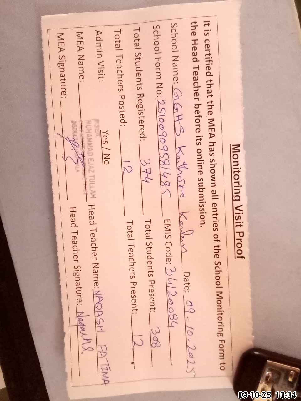 | Attendance Register | Head Teacher | MEA with School | Visit Proof |