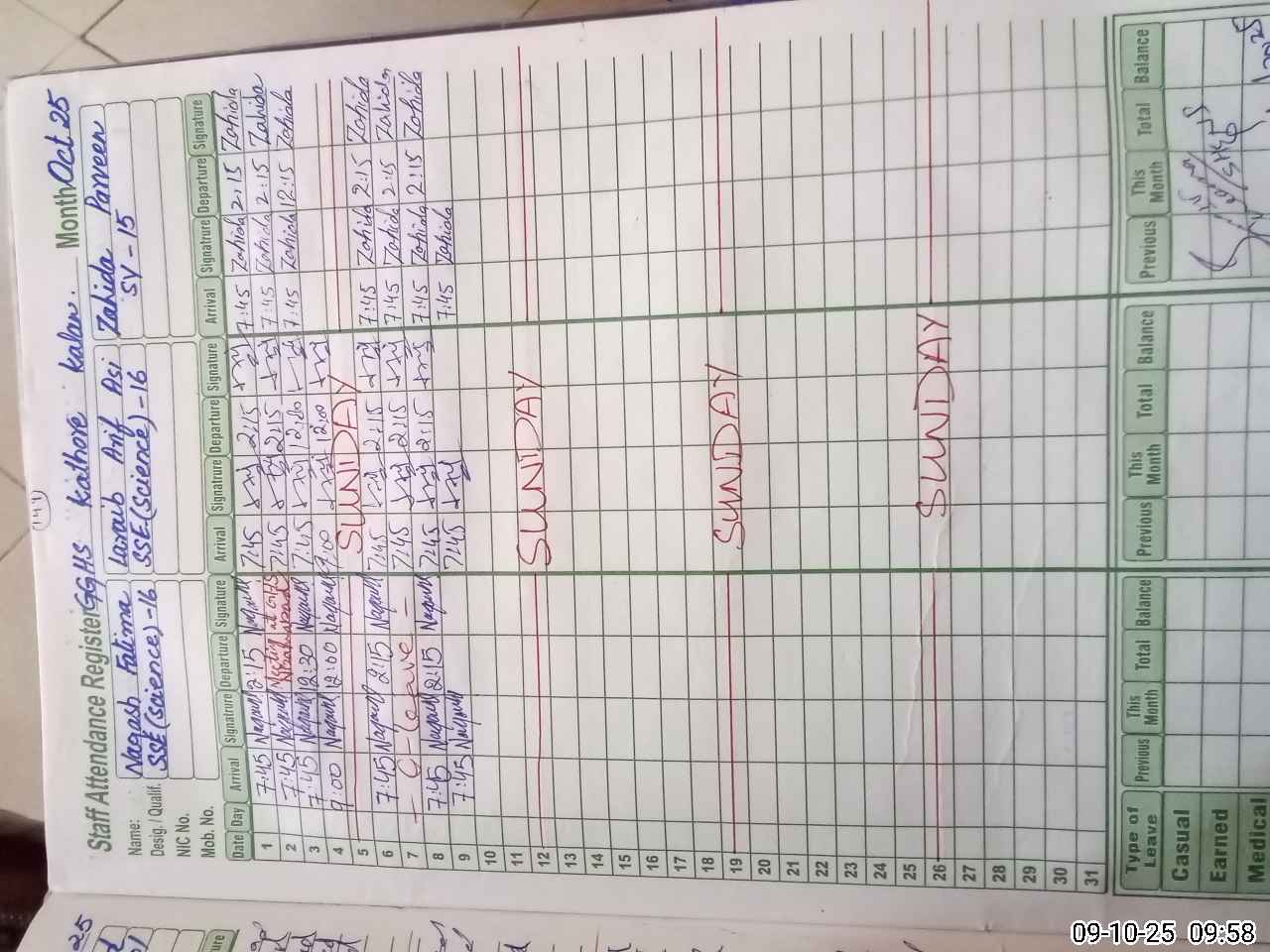 | CNIC | Full Name | Designation | R/C | Absence During Last Calender Month |
