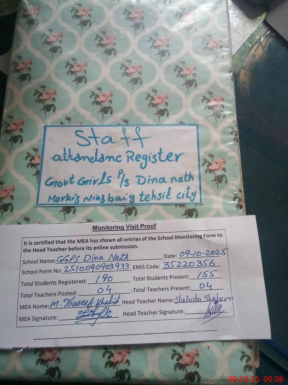 | Attendance Register | Head Teacher | MEA with School | Visit Proof |
