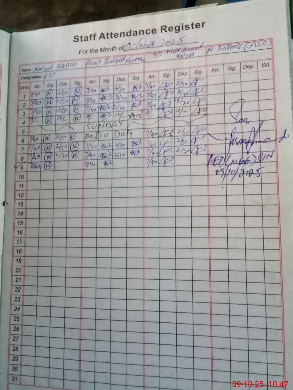 | CNIC | Full Name | Designation | R/C | Absence during last cal. month |