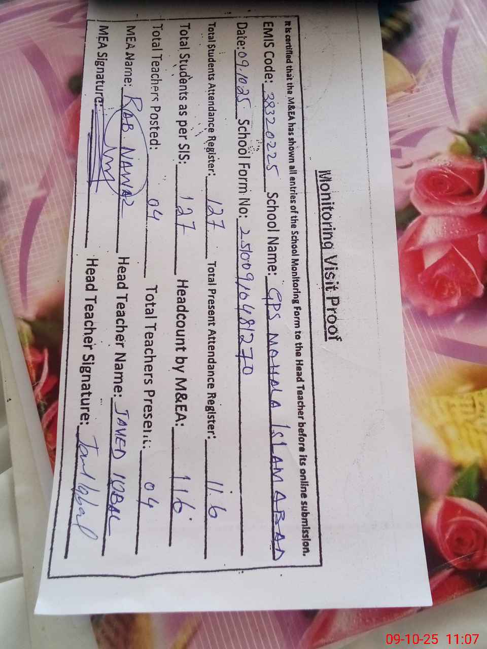 | Attendance Register | Head Teacher | MEA with School | Visit Proof |