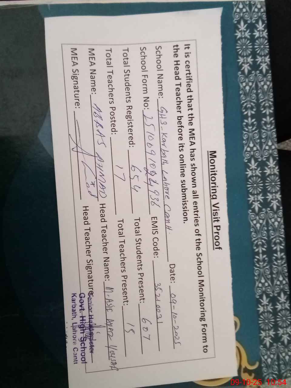 | Certified that this School was Inspected by the Undersigned MEA/DMO Today and the Information Stated Above is as Per Record. | |||||