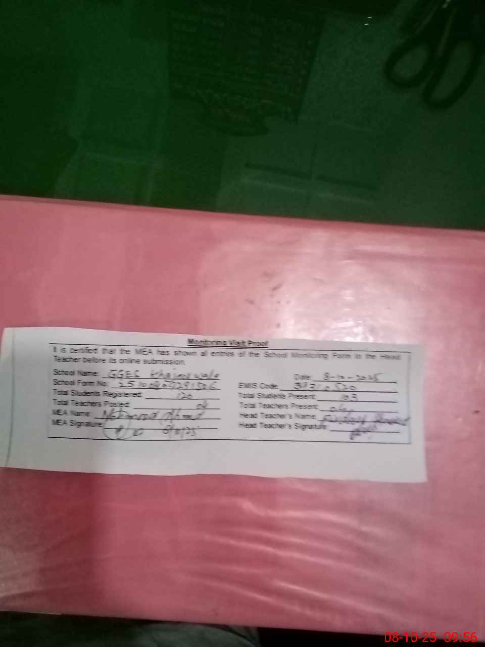| Attendance Register | Head Teacher | MEA with School | Visit Proof |