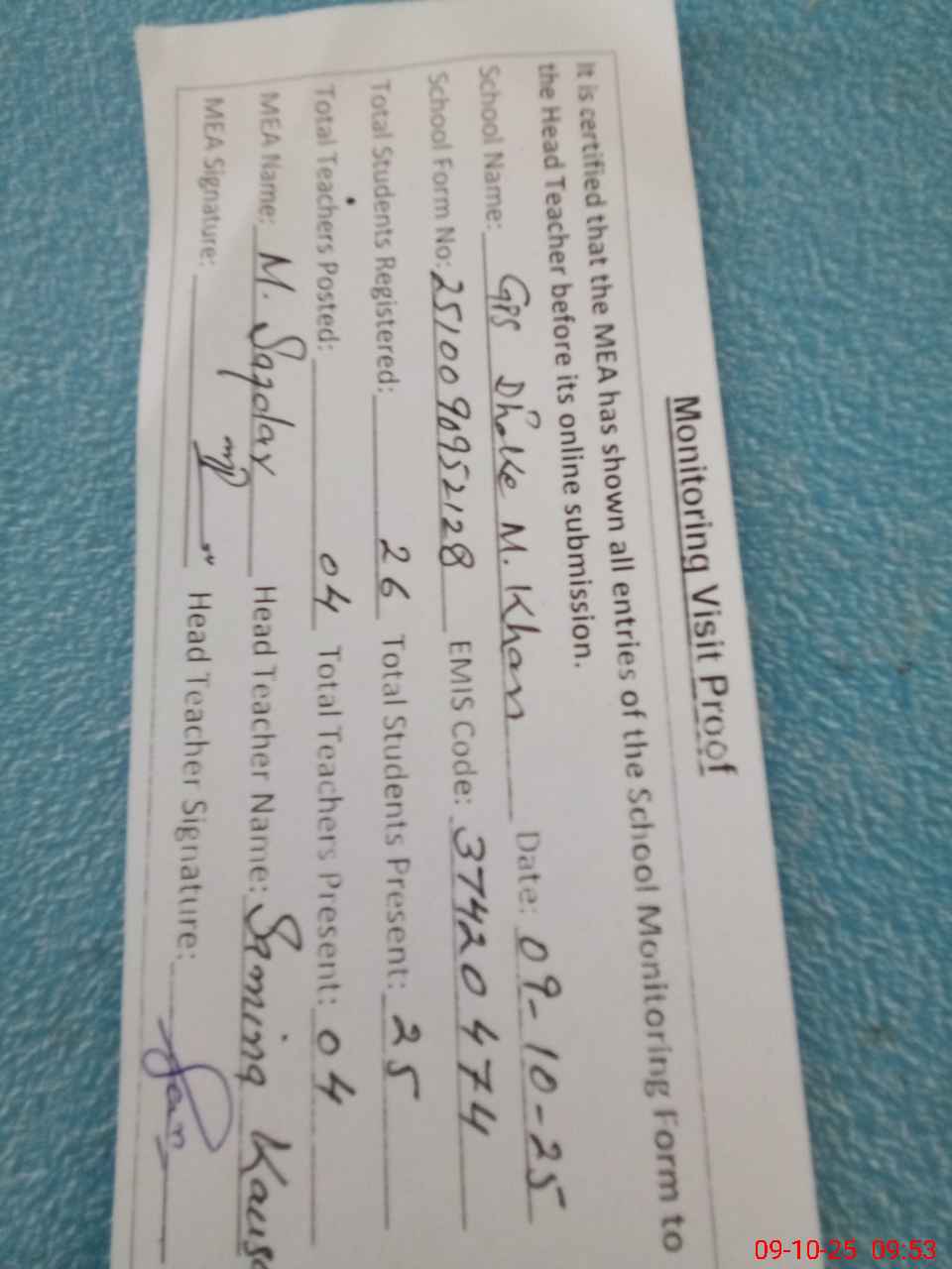 | Attendance Register | Head Teacher | MEA with School | Visit Proof |