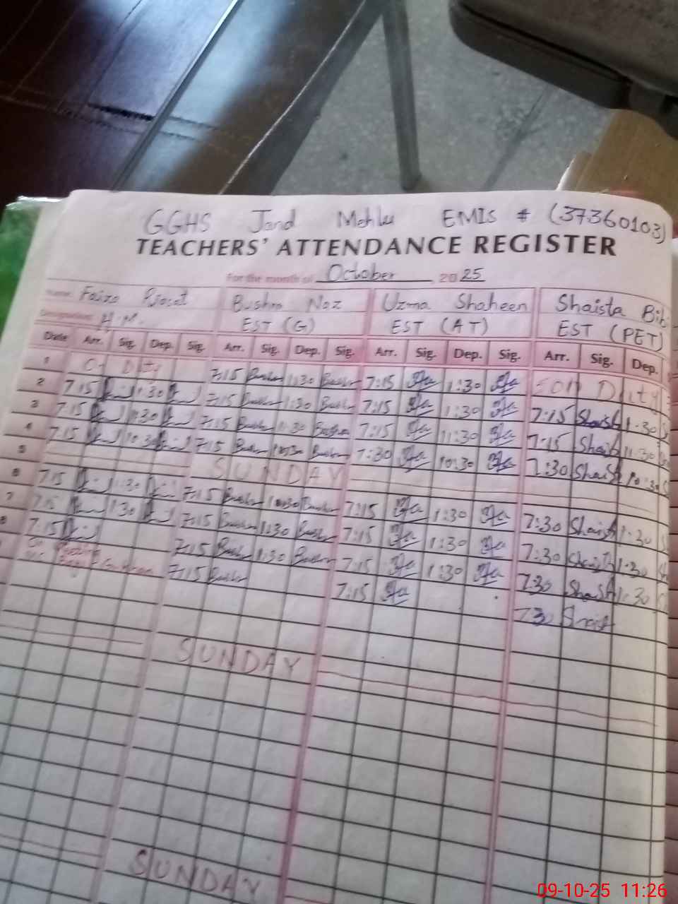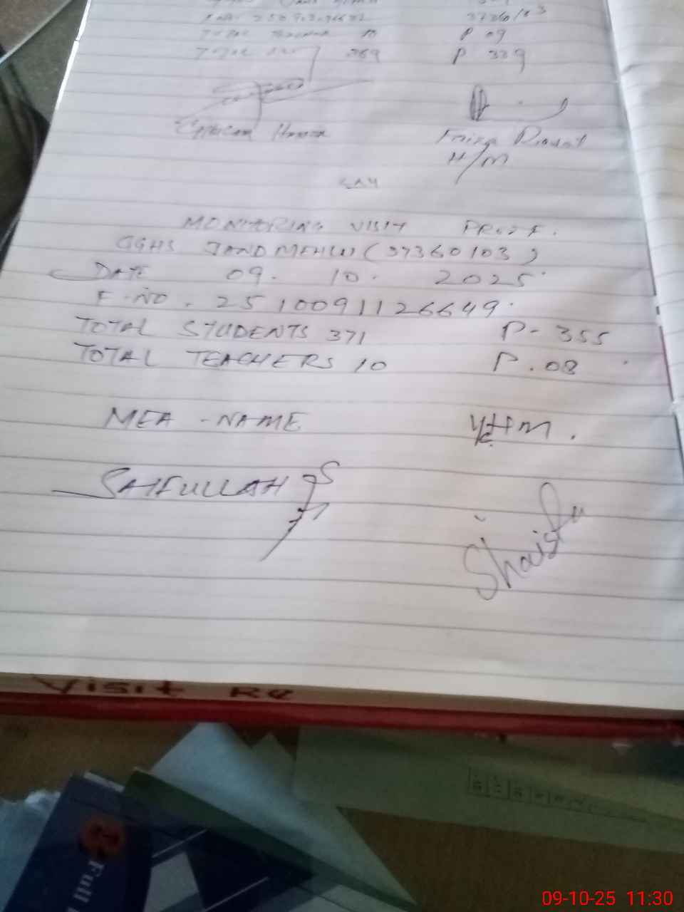 | Attendance Register | Head Teacher | MEA with School | Visit Proof |