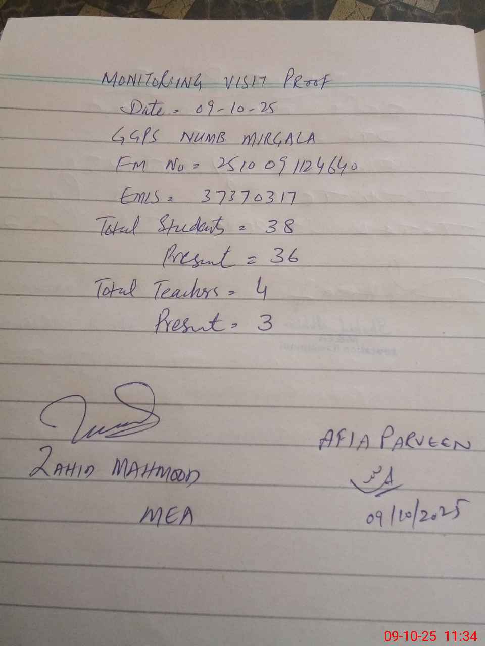 | Monitoring Date: 09-10-2025 | Start Time: 09-10-2025 11:20 AM | End Time: 09-10-2025 11:40 AM | Name of MEA: Za**** Me**** | |