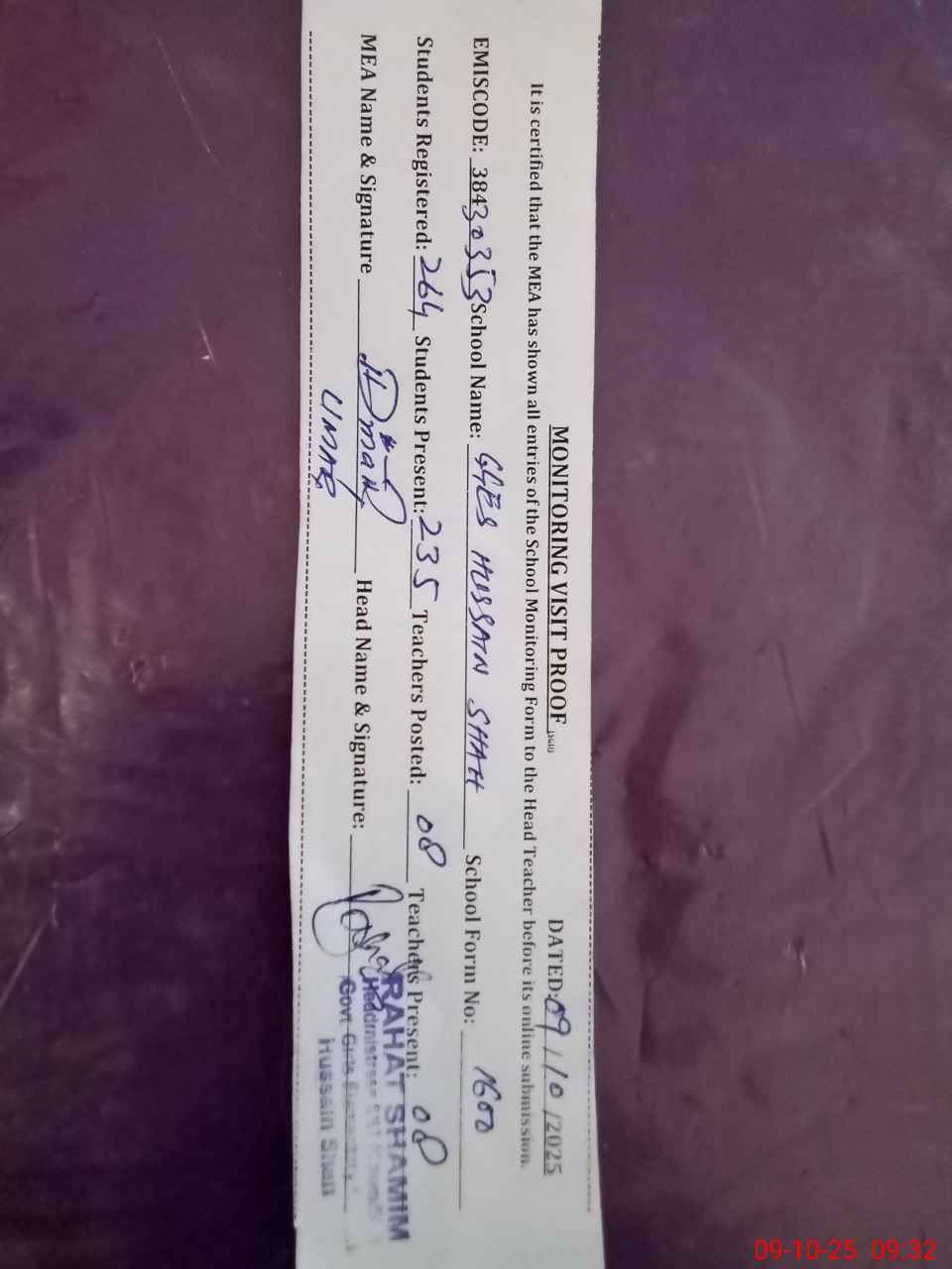 | Attendance Register | Head Teacher | MEA with School | Visit Proof |