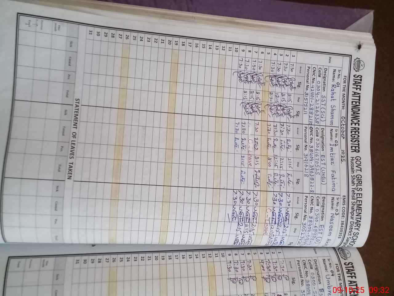 | CNIC | Full Name | Designation | R/C | Absence during last cal. month |