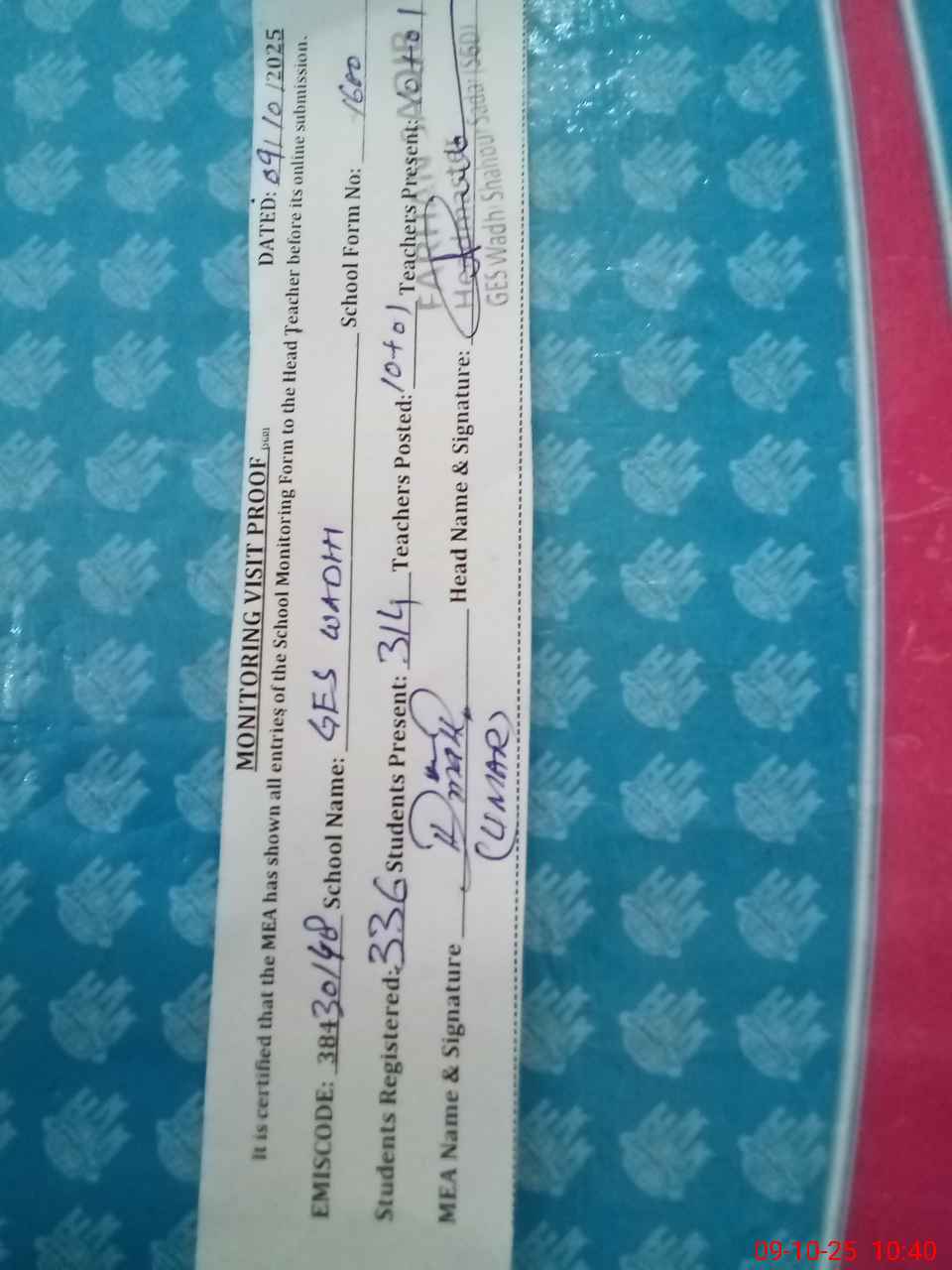 | Certified that this School was Inspected by the Undersigned MEA/DMO Today and the Information Stated Above is as Per Record. | |||||