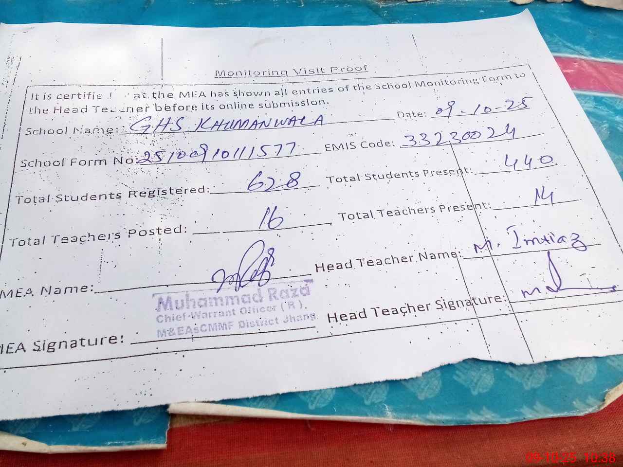 | Certified that this School was Inspected by the Undersigned MEA/DMO Today and the Information Stated Above is as Per Record. | |||||