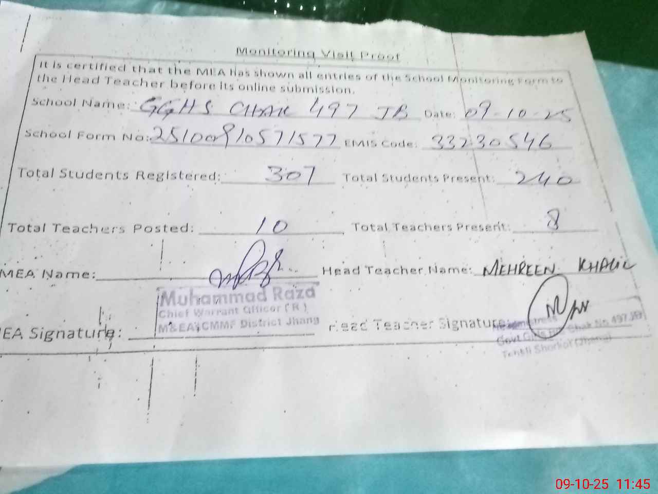 | EMIS Code: 33230546 | Name of School: GGHS CHAK NO. 497 JB | |||