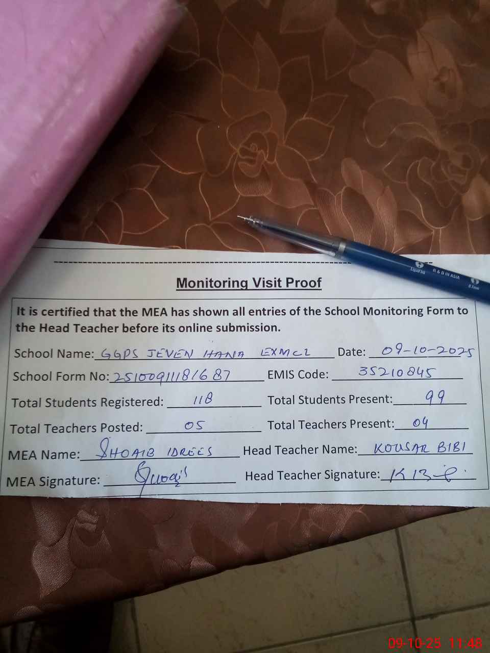 | Attendance Register | Head Teacher | MEA with School | Visit Proof |