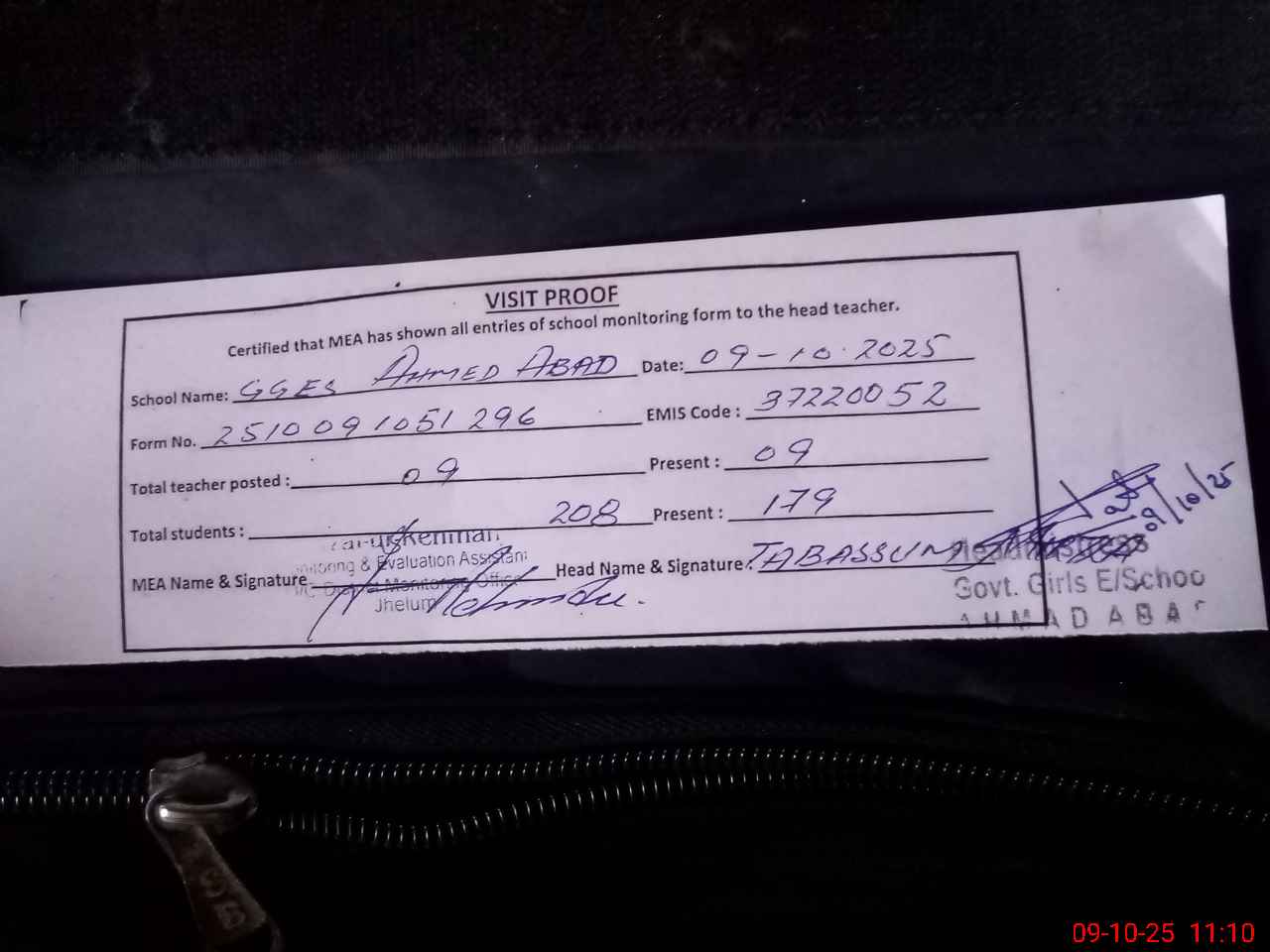 | Attendance Register | Head Teacher | MEA with School | Visit Proof |