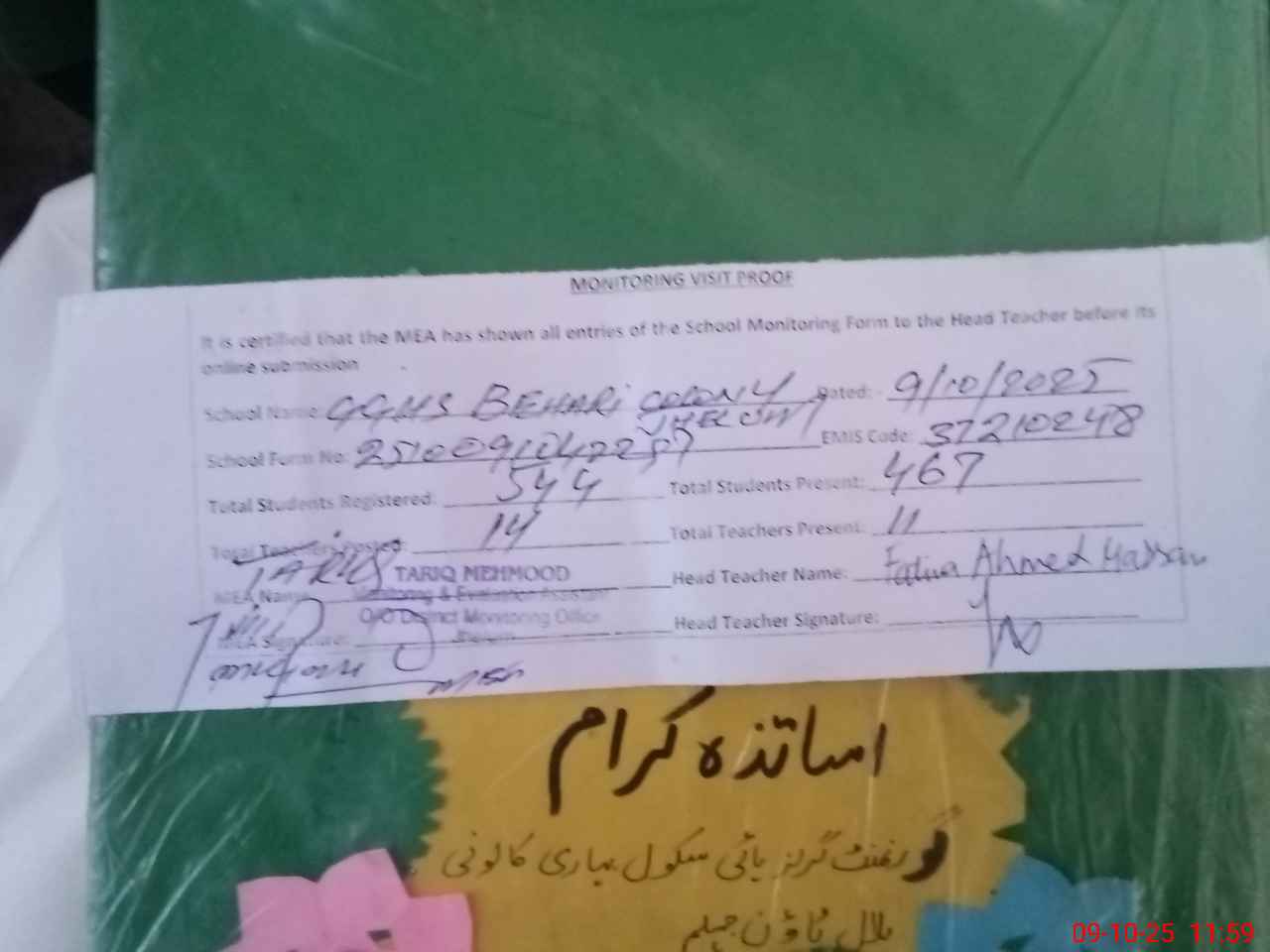 | EMIS Code: 37210248 | Name of School: GGHS BIEHRAI COLONY BILAL TOWN | |||