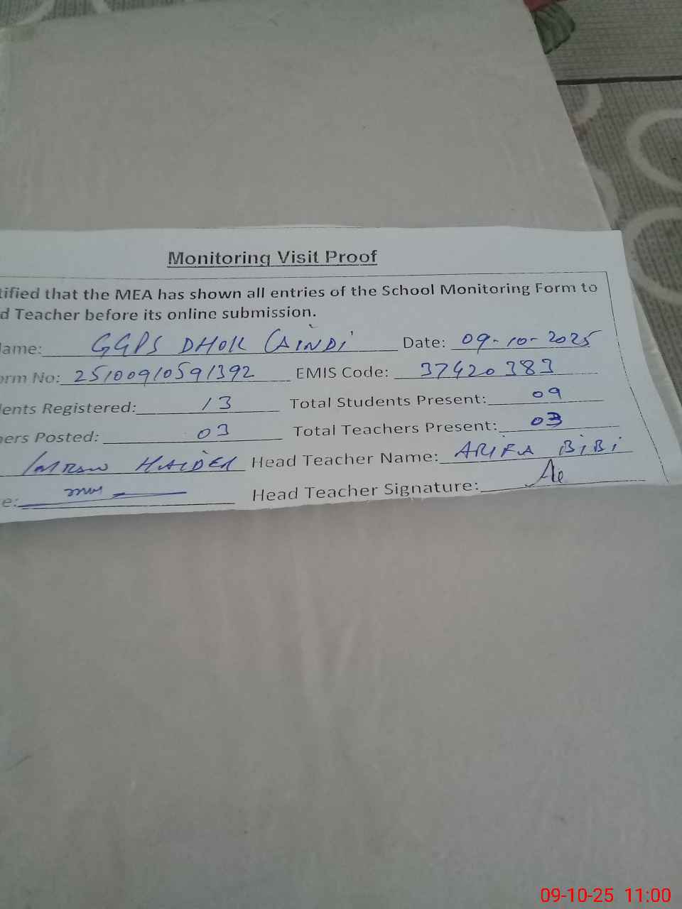 | Attendance Register | Head Teacher | MEA with School | Visit Proof |