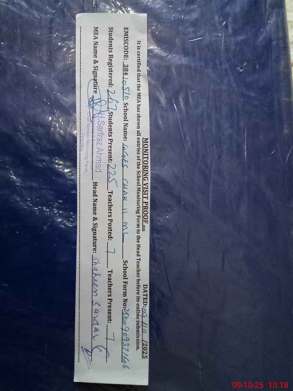 | Monitoring Date: 09-10-2025 | Start Time: 09-10-2025 09:35 AM | End Time: 09-10-2025 10:19 AM | Name of MEA: HA**** SA**** AH**** | |