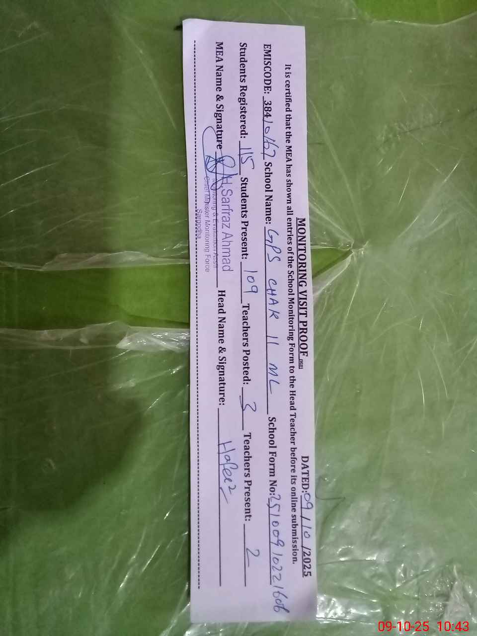 | Monitoring Date: 09-10-2025 | Start Time: 09-10-2025 10:22 AM | End Time: 09-10-2025 10:44 AM | Name of MEA: HA**** SA**** AH**** | |