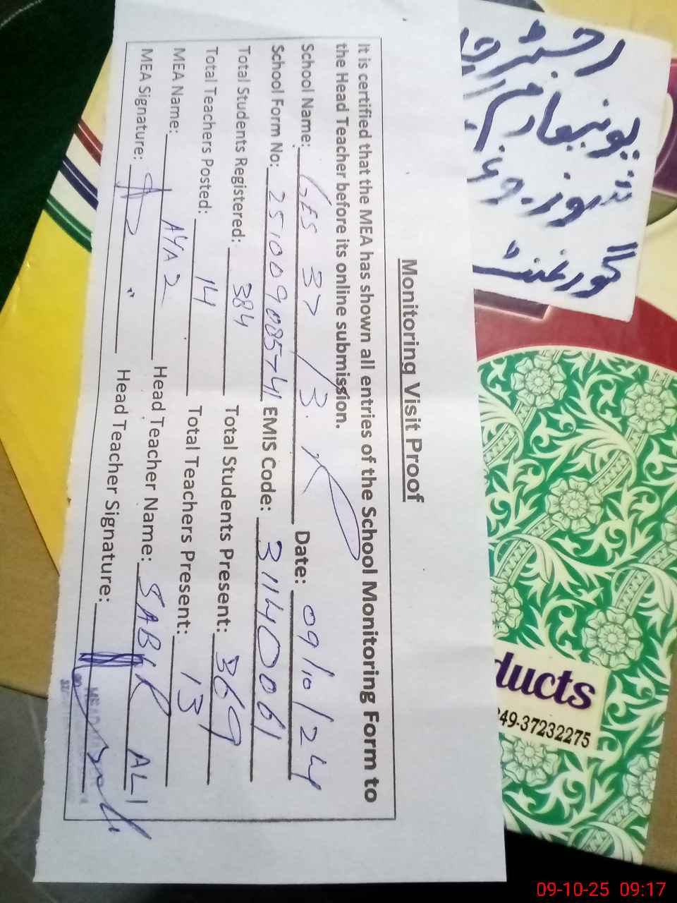 | Attendance Register | Head Teacher | MEA with School | Visit Proof |