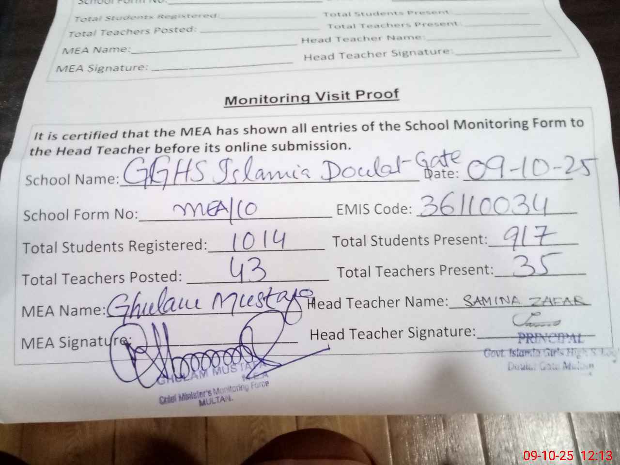 | EMIS Code: 36110034 | Name of School: GGHS ISLAMIA DOULAT GATE MULTAN | |||