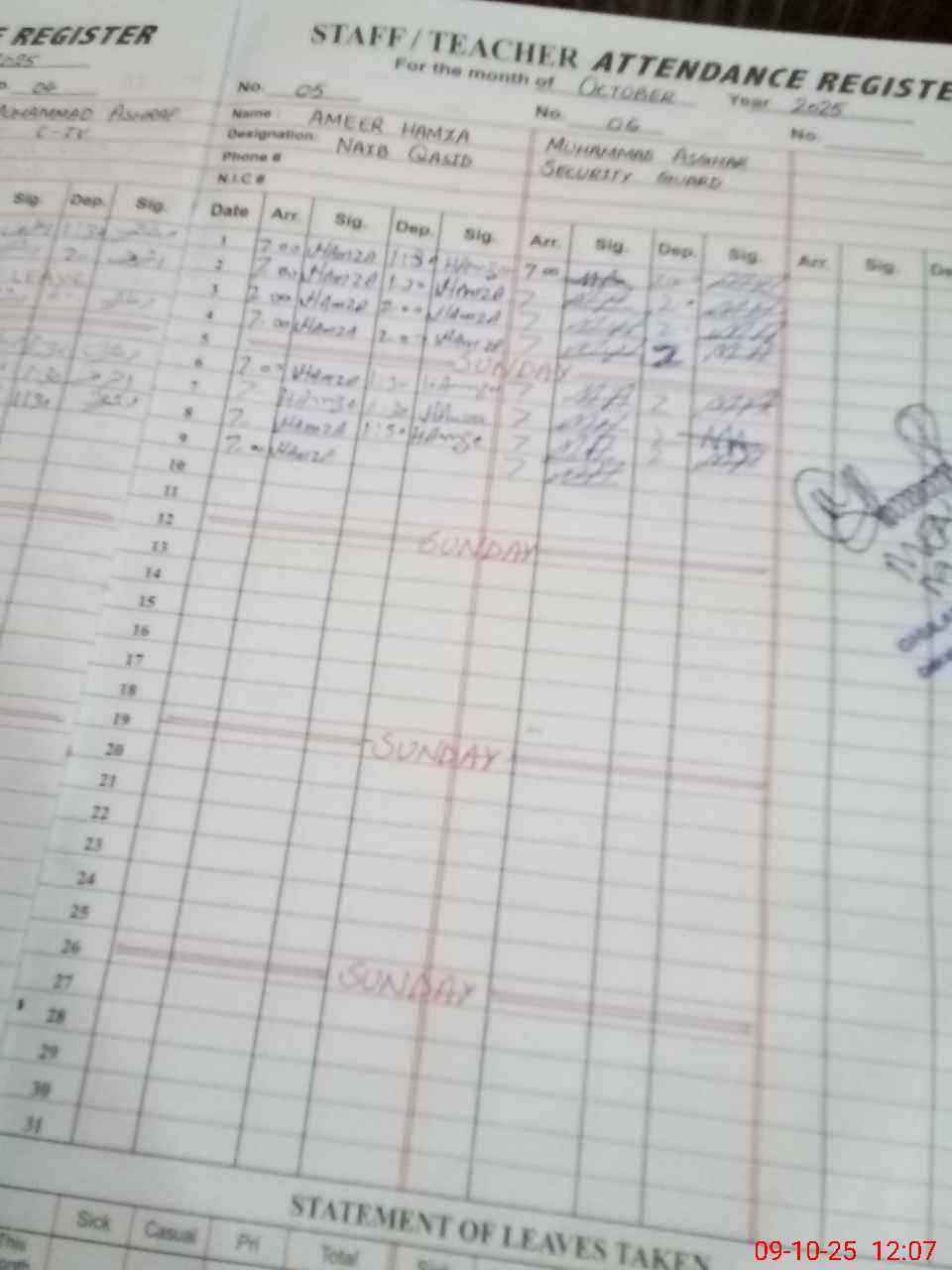 | CNIC | Full Name | Designation | R/C | Absence during last cal. month |