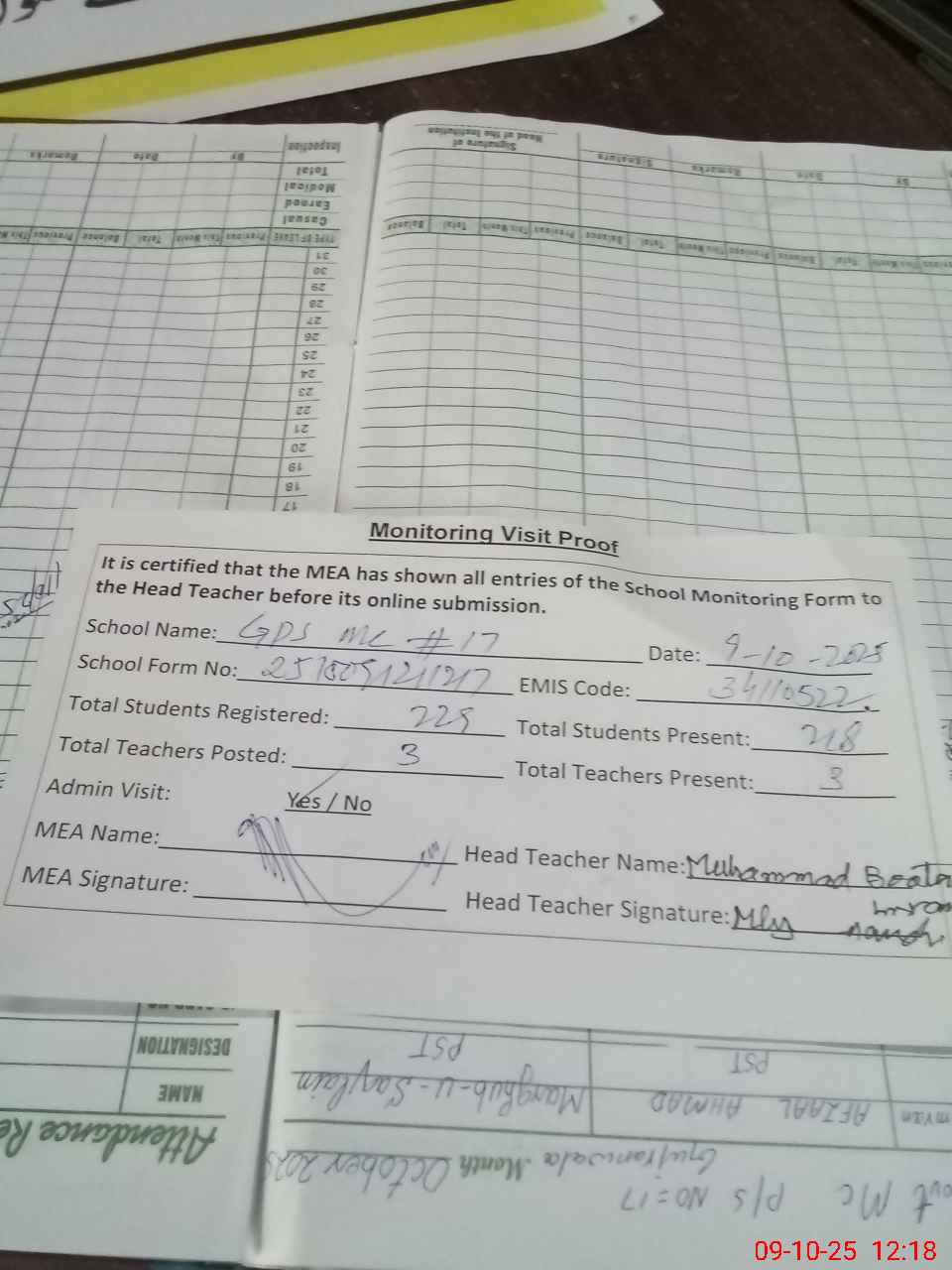 | Attendance Register | Head Teacher | MEA with School | Visit Proof |